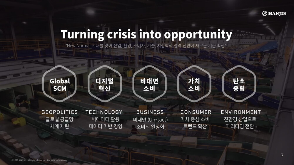 그동안 저희 한진이 성장해오면서 많은 어려움이 있었습니다. 1990년대 말에 IMF사태가 있었고 2009년도에 글로벌 금융위기.