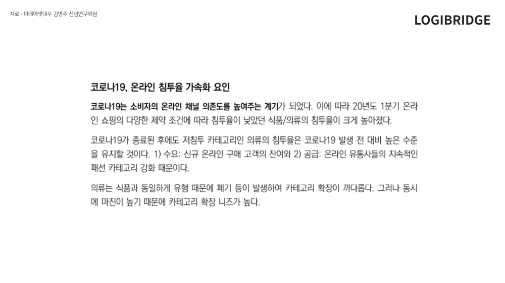 ○로지브리지 김동민(이하 동) : 안녕하세요 오늘은 2020년 유통산업 결산과 2021년 유통산업 전망을 해보려고 합니다. 유통 전문가 두 분을 모셨는데요. 미래에셋대우 김명주 선임연구위원, 디지털이니셔티브그룹 김형택 대표. 반갑습니다.