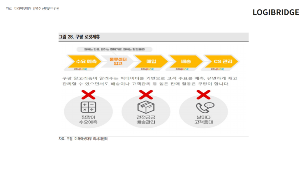 그러면 얘네가 어떤 방향성을 갈 것인가 저희는 예측이 가능하죠. 쿠팡은 지금 실질적인 풀필먼트 서비스를 제공을 하고 있죠.