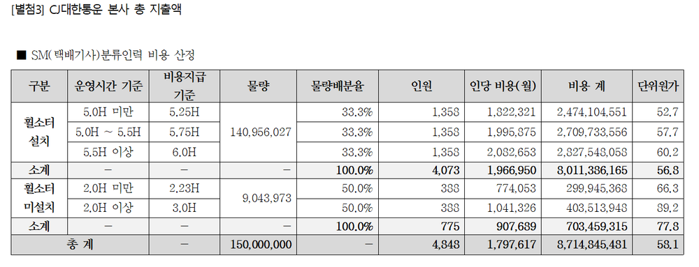 이렇게 선전을 했는데 느닷없이 이게 마치 택배노동자들의 처우 개선을 위해서 쓴 것 마냥 곤지암 메가허브나 휠소터 설치 그리고 이천에 MP시스템 설치 이런 것들이 마치 택배기사들 처우 개선을 위해 쓴 것마냥 선전하는데 이것은 전혀 맞지 않다. 이것은 CJ 자체적으로 물량을 빨리 회전시키기 위한 업무의 효율성을 위한 설비투자지 택배기사들의 처우개선과는 전혀 관련이 없는 사항이다. 이것을 분명히 말씀을 드리고.