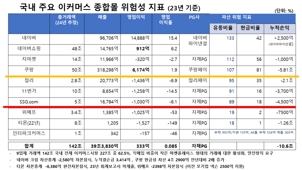11번가 역시도 작년도 기준으로 마이너스 1258억 적자 그리고 누적으로는 3700억의 영업적자가 쌓여 있습니다. 쓱닷컴 역시 작년에 130억 적자가 났었고 누적으로 한 4,500억 정도의 적자가 쌓여 있기 때문에 이 세 군데 업체는 이 누적 손익이 마이너스가 커지면 커질수록 위험 부담이 커지는 부분이 있습니다.