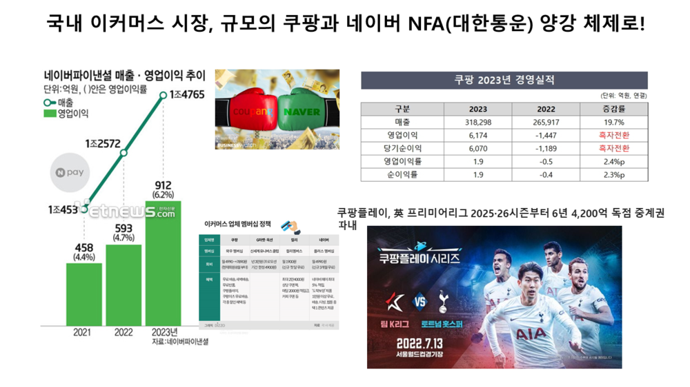 작년에는 네이버에서 프리미어리그 중계를 했었는데 쿠팡으로 넘어갔다는 거죠. 손흥민 경기를 보기 위해서 이제 우리는 쿠팡에 가입한 남자. 이런 남성 고객들을 많이 볼 수가 있을 것 같고요. 이런 흐름을 타고 지금 물류센터도 2027년까지 계속 지속적으로 확장하는 계획을 세워놨기 때문에 쿠팡이 원톱 체제로 갈 수도 있는 좋은 교두보를 만들었다고 생각하고요.