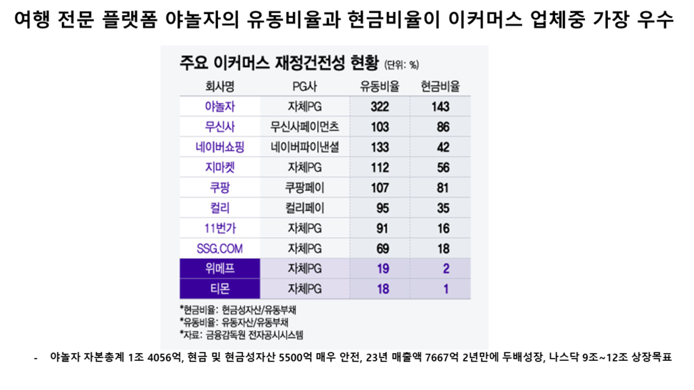 그리고 사실은 이렇게 큰 회사만 있는 게 아니라 버티컬커머스라고 해서 나머지 전문적인 분야가 있는데 그중에서 가장 눈에 띄고 가장 건실한 업체가 바로 야놀자라고 생각하는데요. 야놀자는 여행 상품이라든지 티켓들을 많이 판매하고 있는데 자본 총계가 1조 4천억원이나 되고 있기 때문에 큰 문제가 없을 것 같고요.